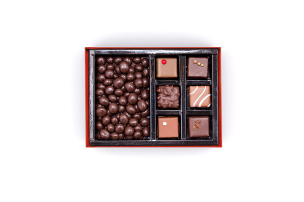 В составе тщательно подобранные ингридиенты: отборный фундук и миндаль собственной обжарки, итальянский шоколад, французское пюре, белорусские сливки.